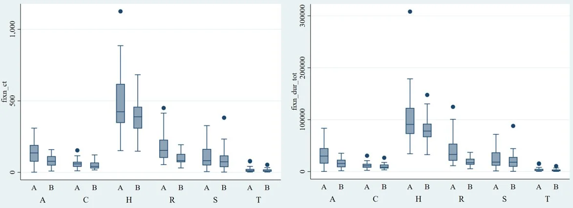 Total fixation count (left), total fixation duration (right) for different AOIs in two interfaces. (A: stance of article, C: predicted correctness, H: news article headlines, R:source reputation, S: news source, T: claim text).