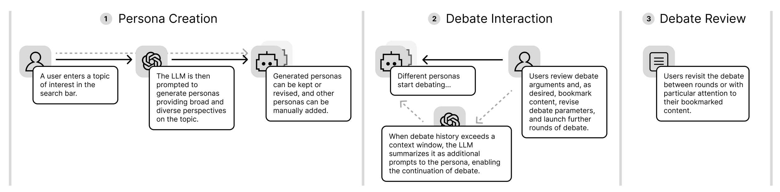 Large language models (LLMs) are enabling designers to give life to exciting new user experiences for information access. In this project, we aim to help users to explore a novel information seeking experience with the support of LLM: letting users launch a debate on any topic of interest in which generated LLM personas present diverse perspectives on the topic.