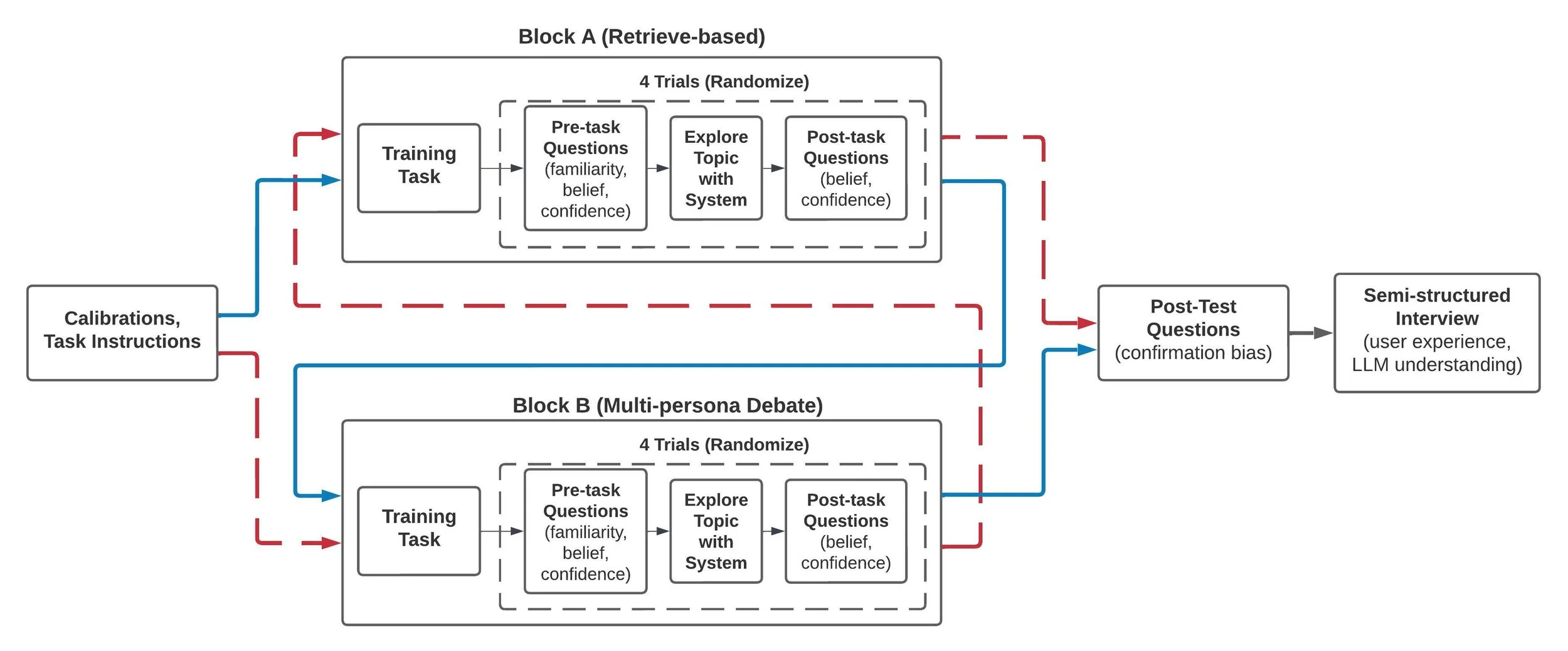 To explore how users might engage with the multi-persona debate system and the system effectiveness of reducing confirmation bias, we conducted a controlled, within-subjects study by comparing the multi-persona debate system with a traditional retrieval-based system.